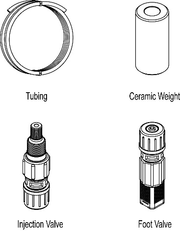 Если материал головки насоса - PVC со шланговым соединением, в дополнение к дозирующему насосу в комплект поставки входят следующие принадлежности.
